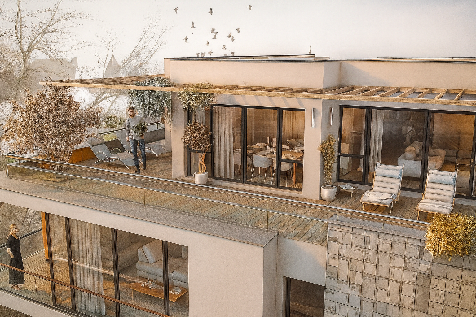 The project consists of a single small 4 story apartment building located in the northern part of Bucharest, in the Floreasca area. The purpose was to create 8 comfortable apartments, with large terraces and balconies, surrounded by vegetation and intimate private spaces, all designed to fit in a very narrow plot on a quiet street.