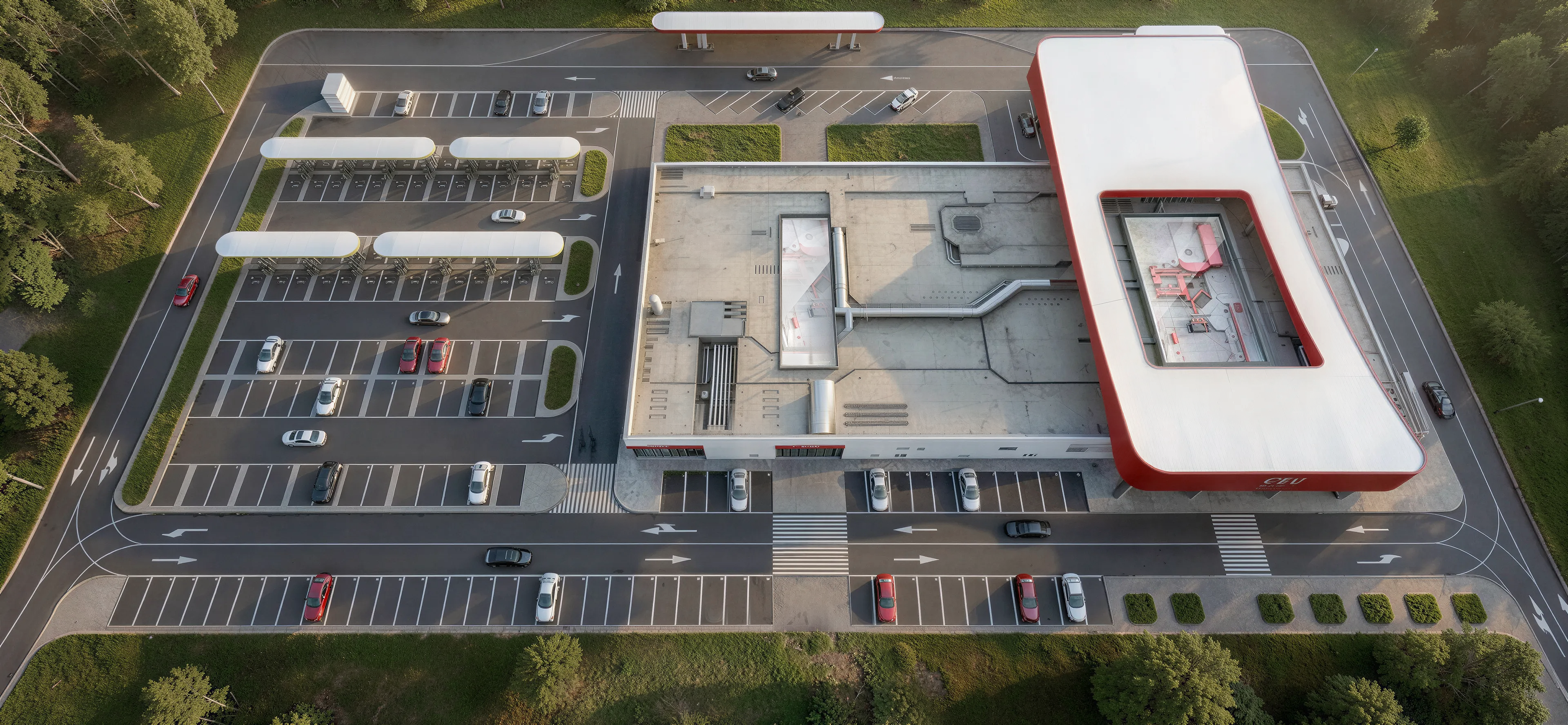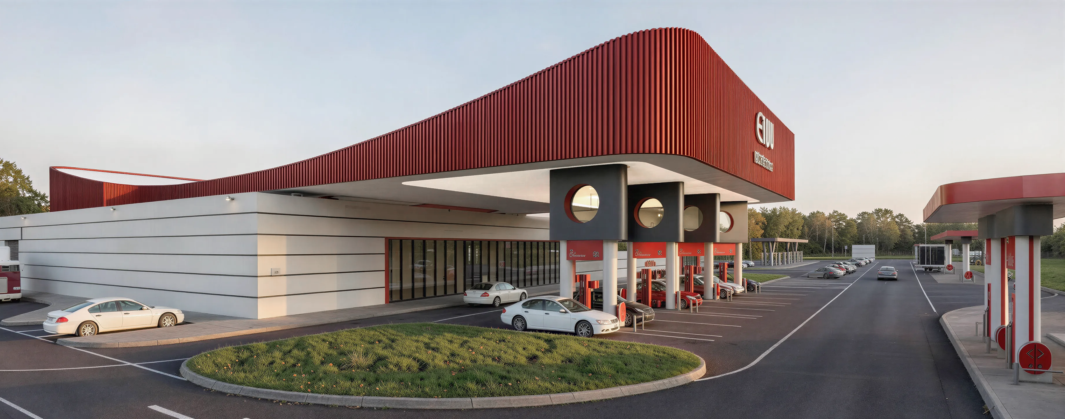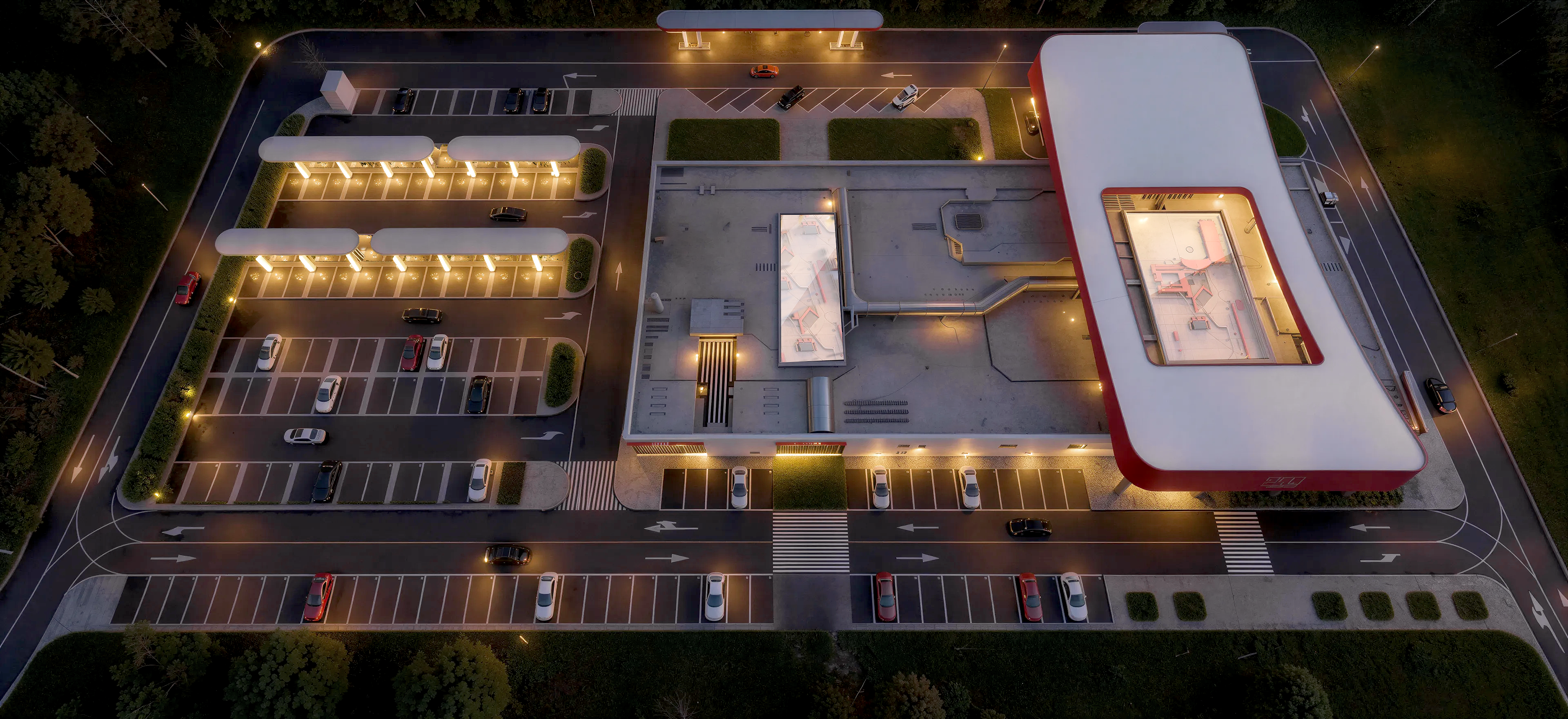 Compoziția integrează coerent funcțiuni multiple — alimentare clasică, încărcare electrică, retail, showroom de tehnologie și servicii complementare — într-un ansamblu unitar, eficient și expresiv. Limbajul arhitectural transmite viteză, inovație și precizie, iar contrastul dintre suprafețele clare, minimalist tratate, și accentele cromatice puternice subliniază caracterul iconic al proiectului.