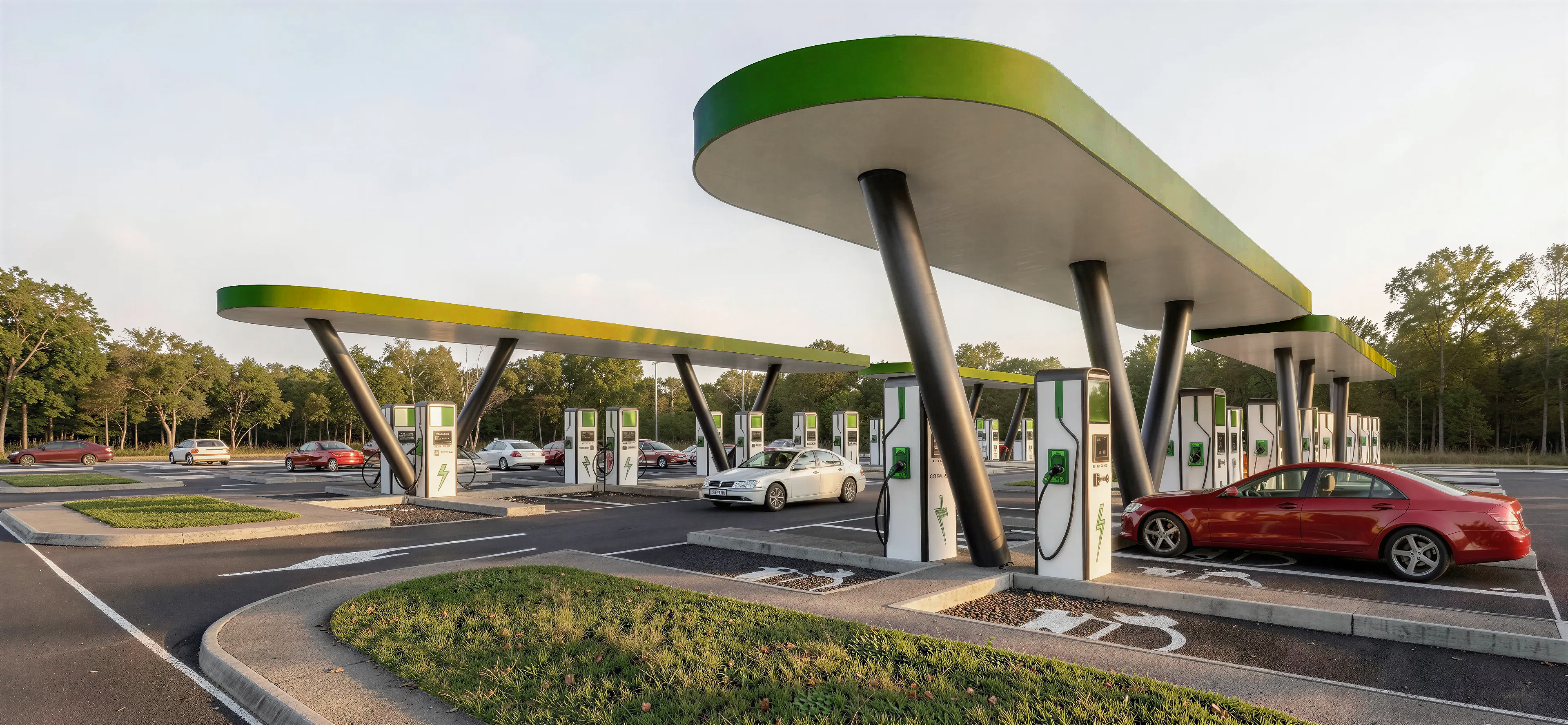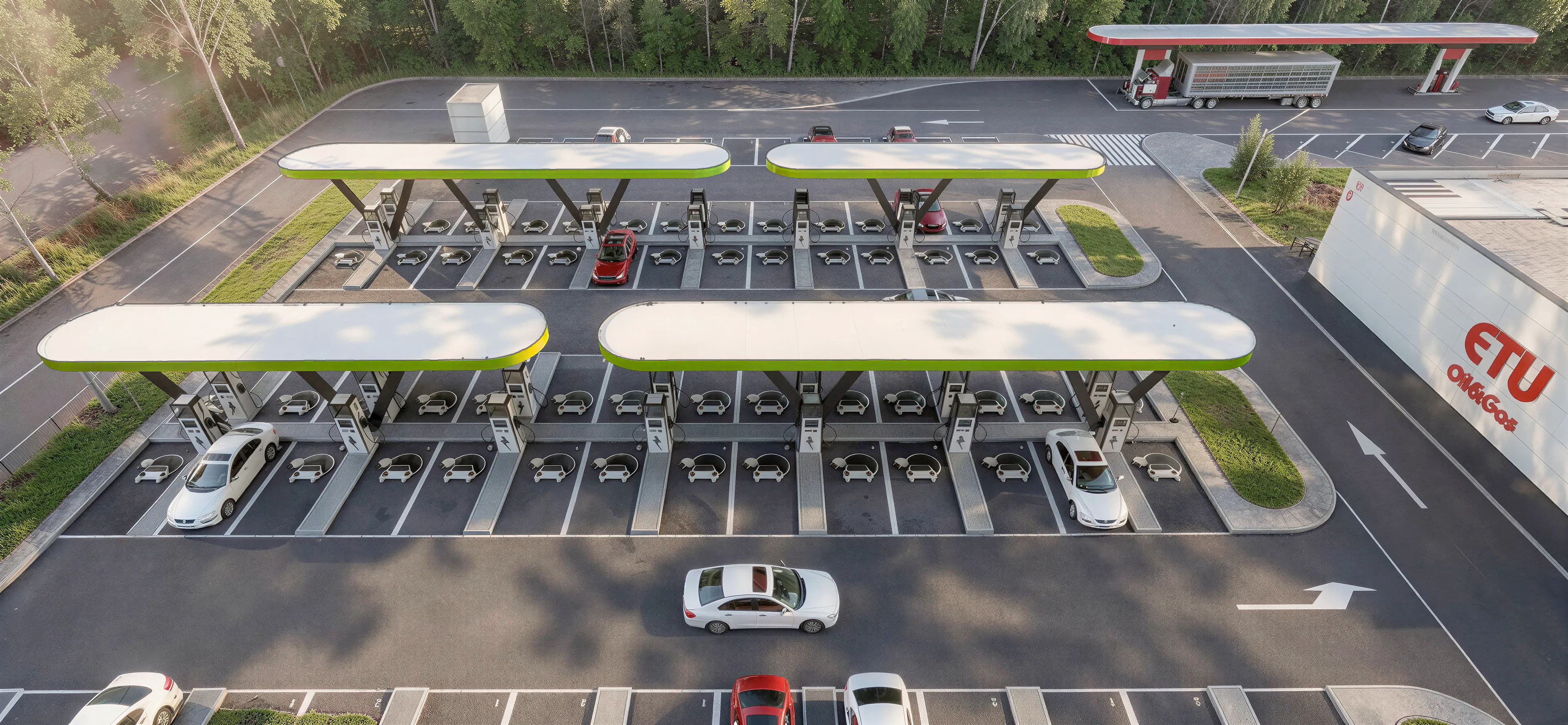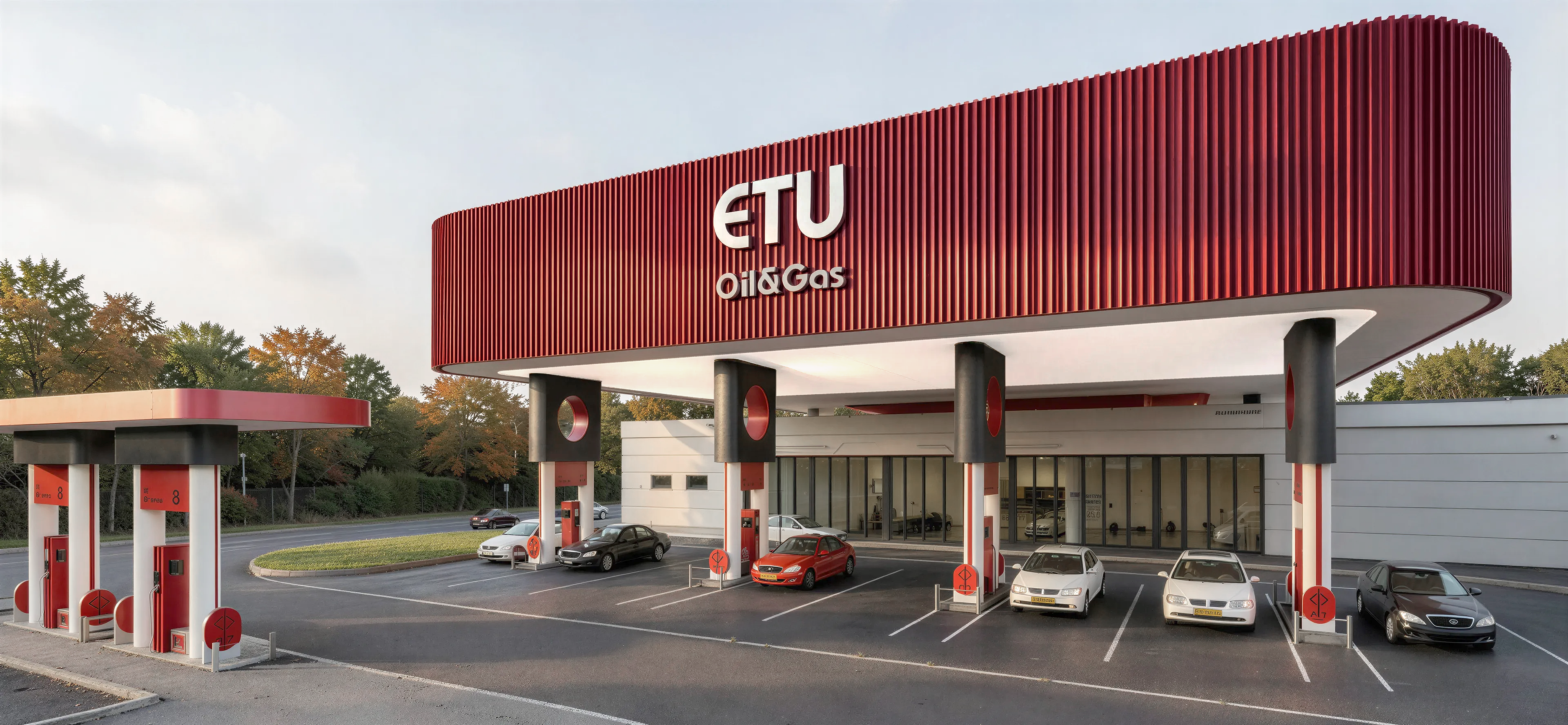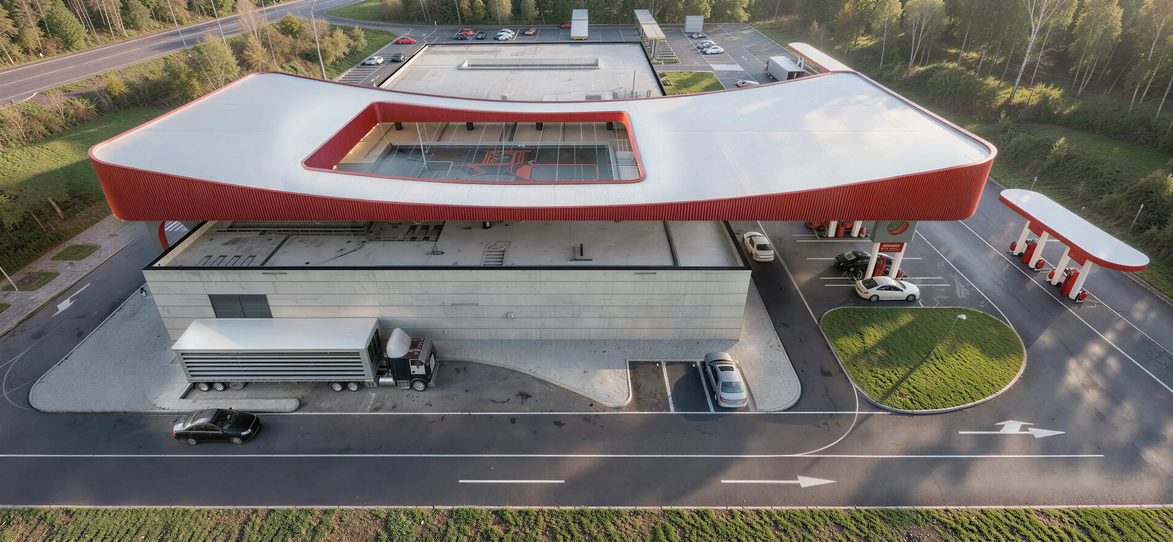 Compoziția integrează coerent funcțiuni multiple — alimentare clasică, încărcare electrică, retail, showroom de tehnologie și servicii complementare — într-un ansamblu unitar, eficient și expresiv. Limbajul arhitectural transmite viteză, inovație și precizie, iar contrastul dintre suprafețele clare, minimalist tratate, și accentele cromatice puternice subliniază caracterul iconic al proiectului.
