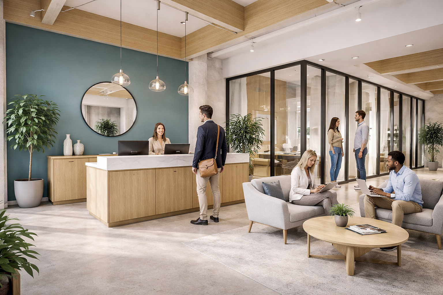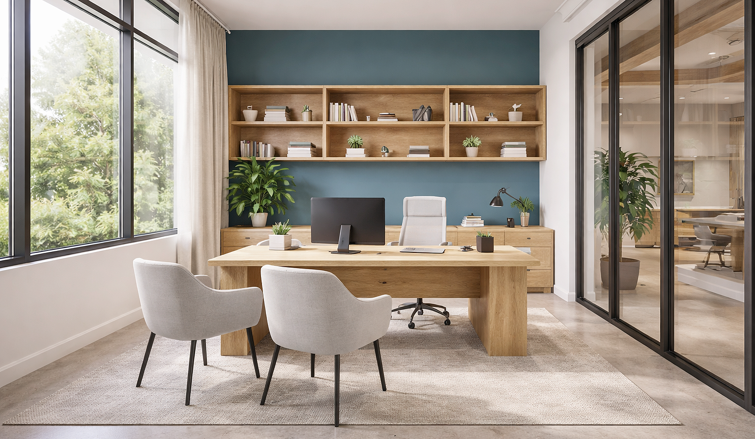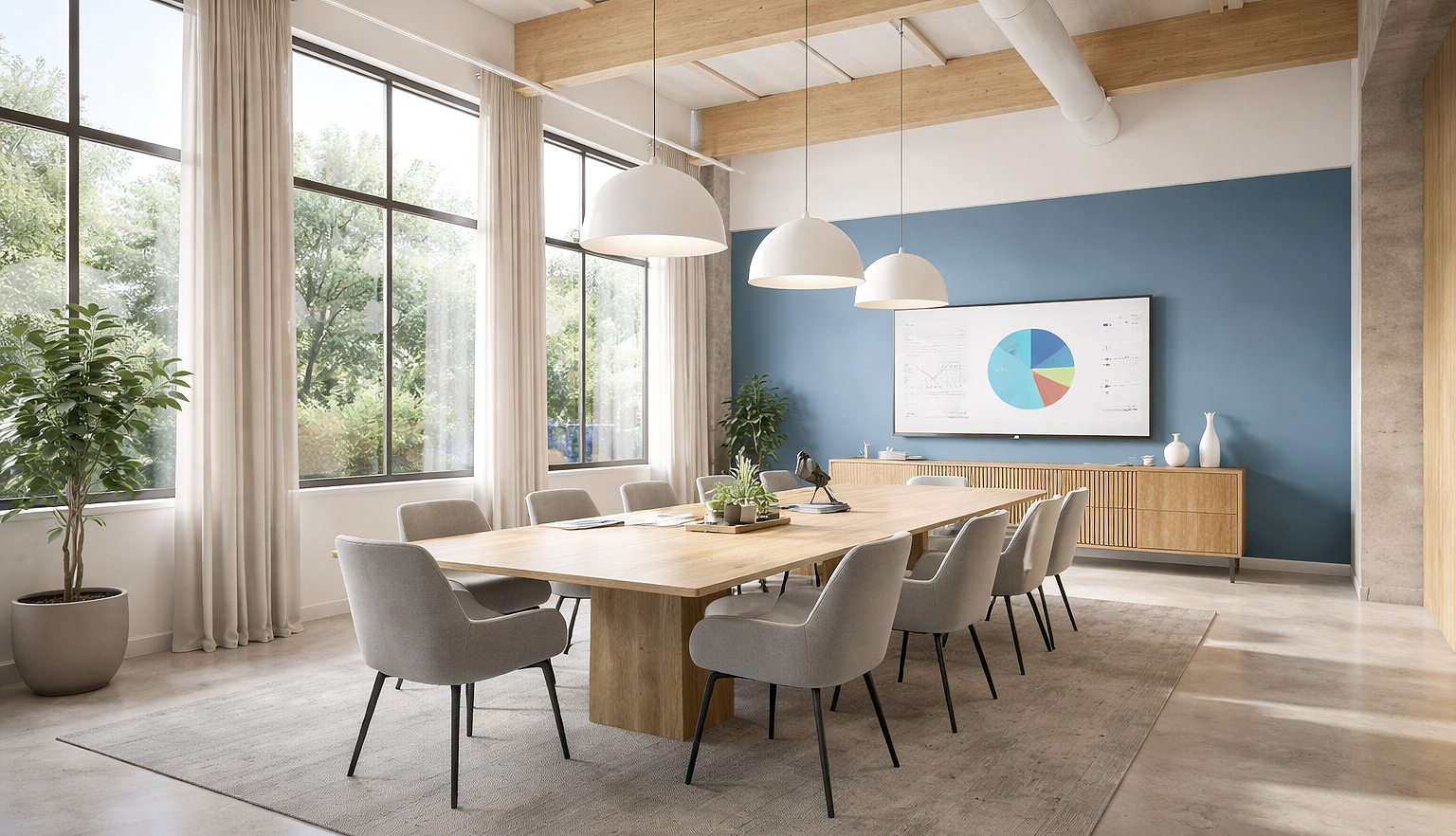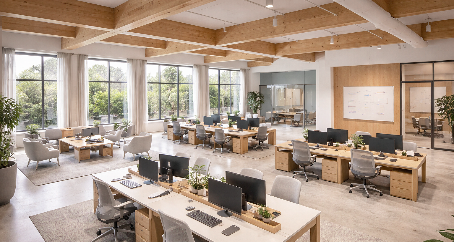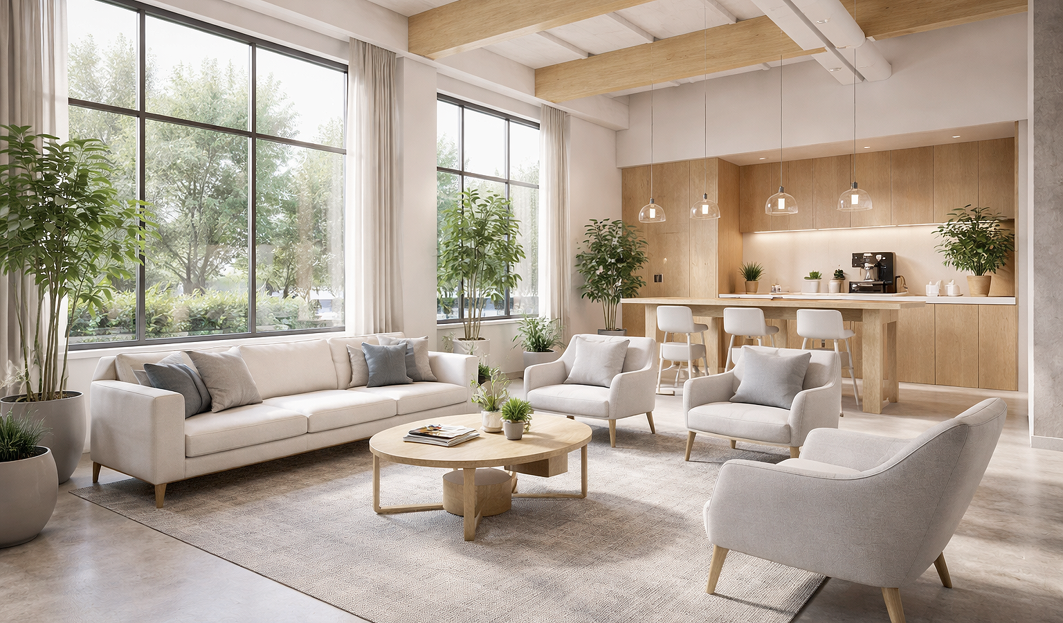 The interior proposal follows a contemporary office language defined by openness, natural light, and a calm architectural clarity. Across all spaces, the design blends a warm modern aesthetic with subtle Scandinavian influences: light timber finishes, neutral materials, generous glazing, soft textures, and carefully integrated color accents that give identity without overwhelming the composition. High ceilings, large windows, and clean lines create an airy, spacious atmosphere, while the restrained use of greenery, textured rugs, acoustic surfaces, and suspended lighting adds comfort and refinement.