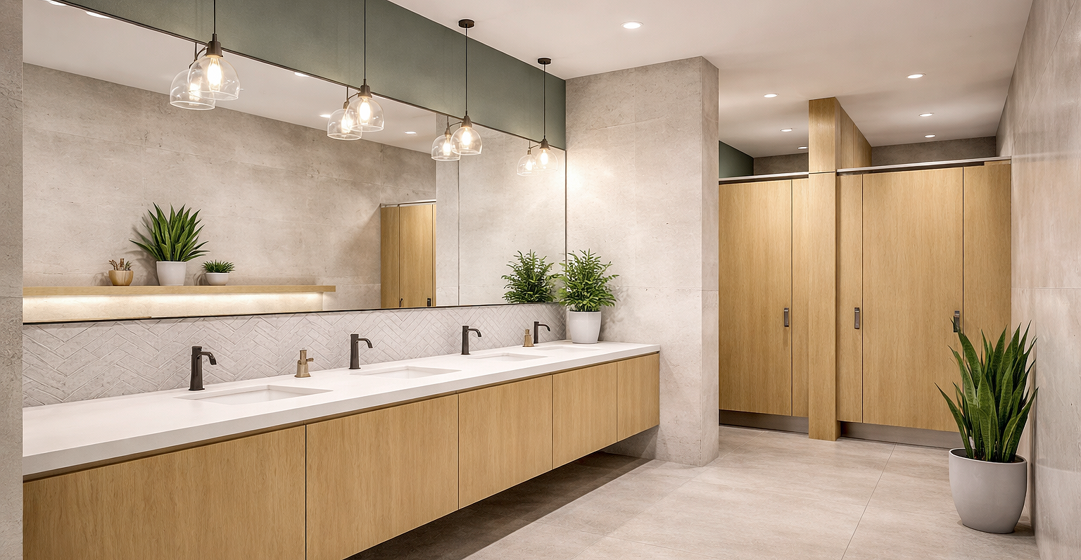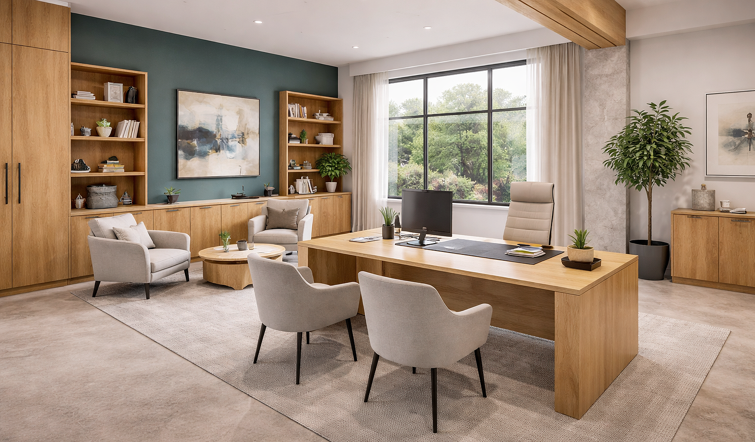 The closed office and executive office develop the same architectural vocabulary in a more private and representative manner, combining contemporary furniture, natural finishes, and accent colors to create spaces that feel both professional and personal. The reception area becomes the public face of the office: open, inviting, and human-centered, with a balanced mix of hospitality, transparency, and understated elegance. Even the toilet area is treated with the same level of design attention, using clean detailing, refined material contrasts, and integrated lighting to maintain continuity throughout the project.