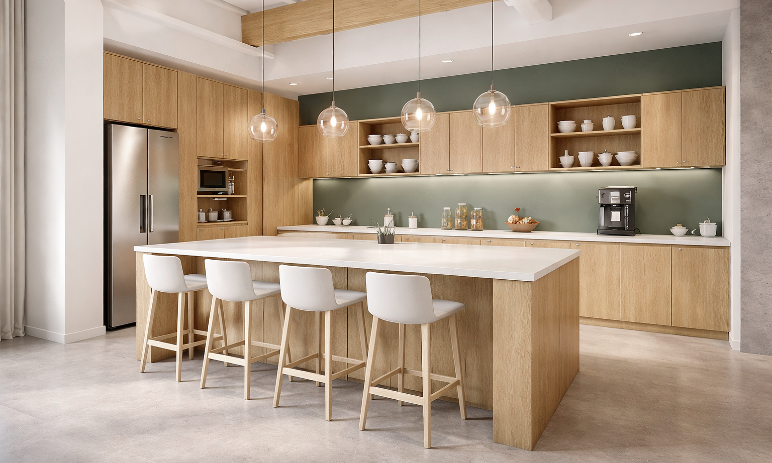 The open-space office is conceived as a bright and collaborative working environment, with flexible workstation clusters and a relaxed visual rhythm that supports both focus and interaction. The meeting room translates the same design language into a more formal setting, where the color-accent wall introduces character and depth within a calm, elegant composition. The informal lounge area softens the workspace through residential-style furniture and a hospitality-inspired atmosphere, encouraging spontaneous meetings and moments of pause. The pantry continues this cohesive identity with a minimalist, functional layout enriched by warm materials and a subtle accent tone that makes the space feel welcoming rather than purely utilitarian.