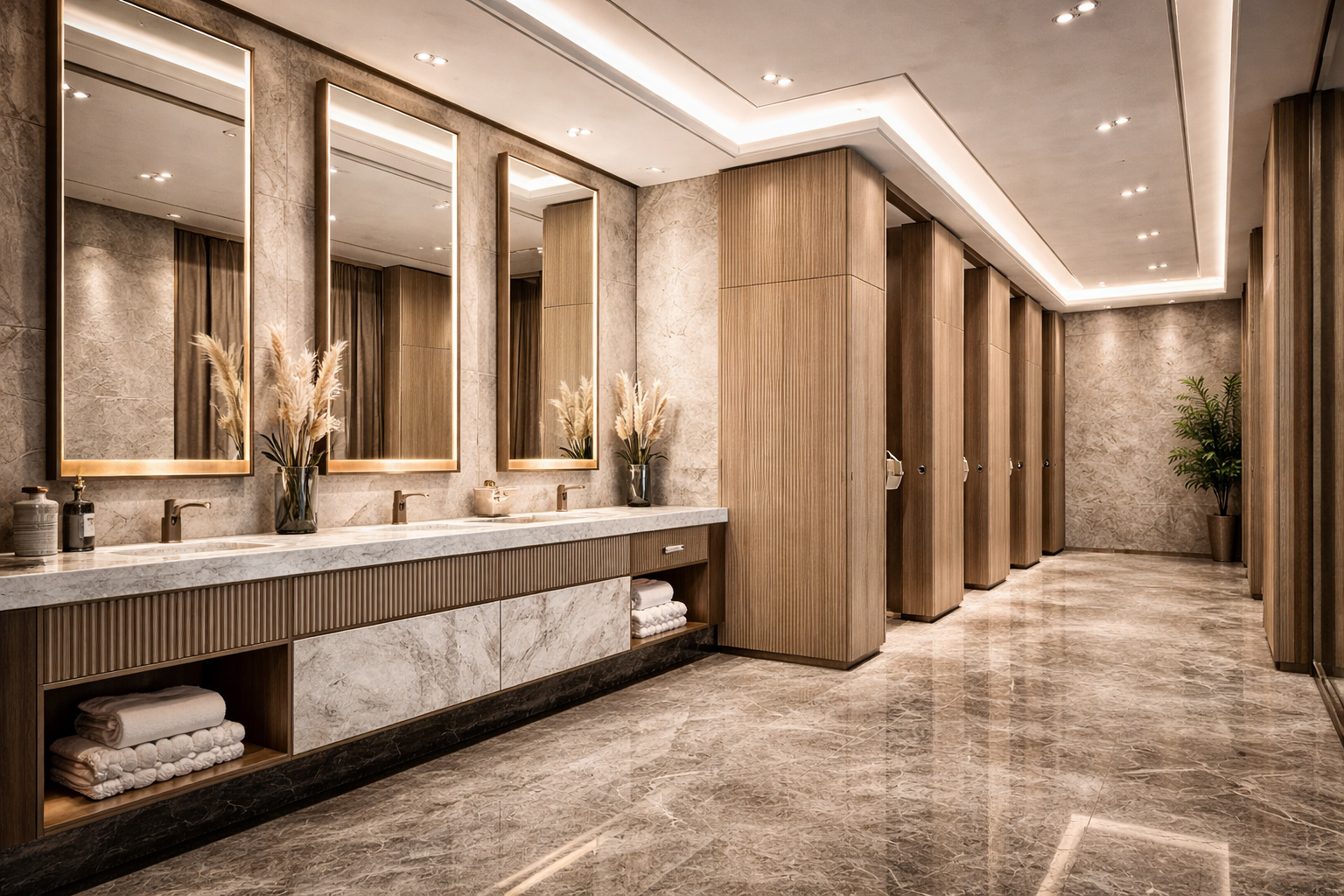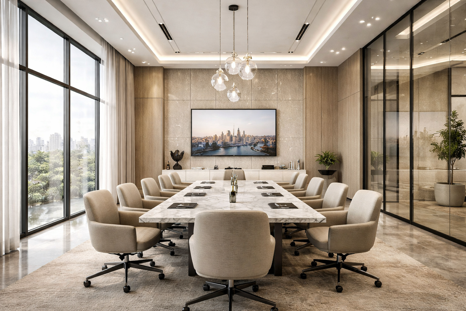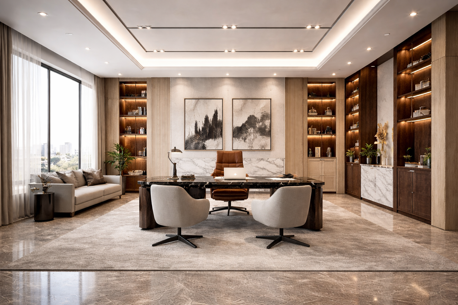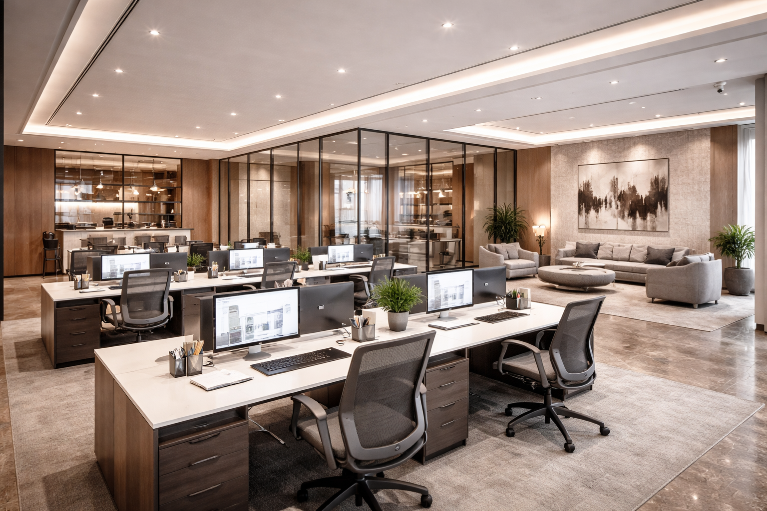 Lighting plays a central architectural role, combining discreet recessed systems with linear and accent illumination to emphasize textures, depth, and material transitions. The overall composition conveys a sense of understated luxury—where precision, proportion, and material quality define a sophisticated and contemporary workplace.