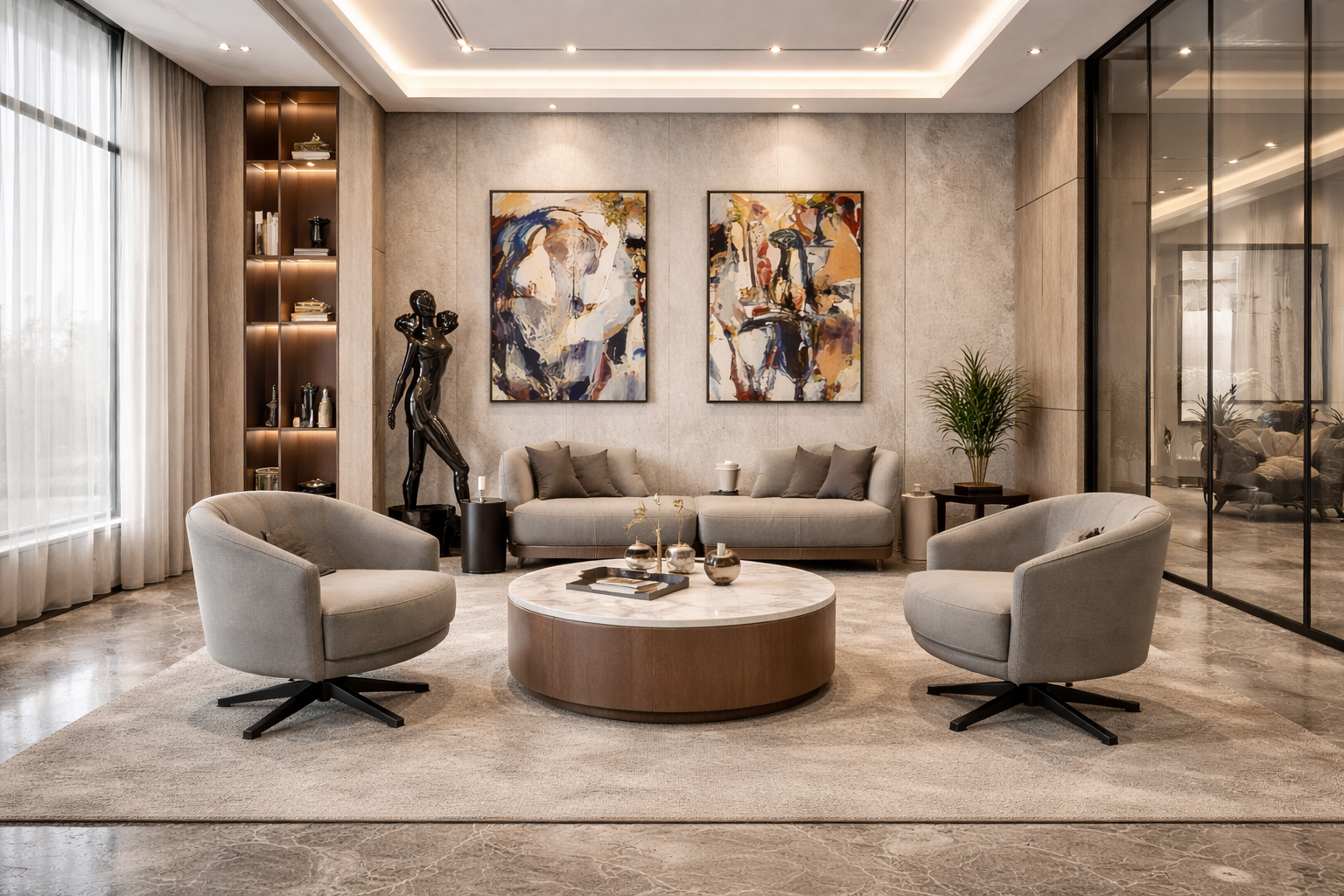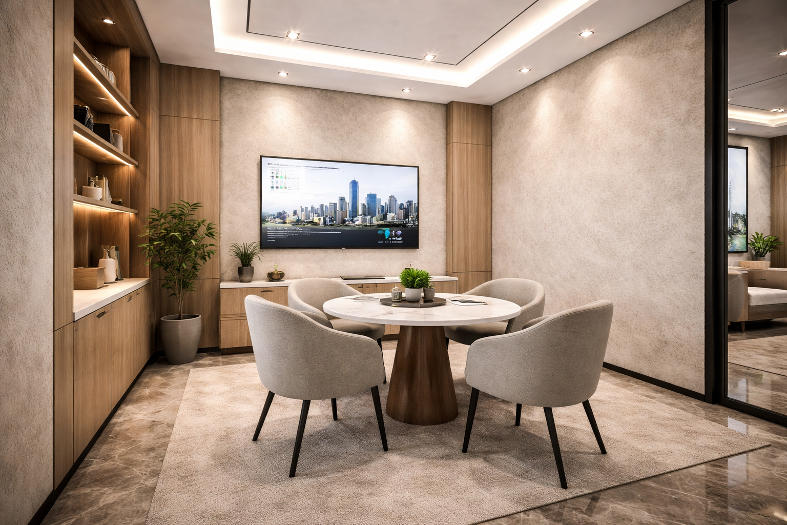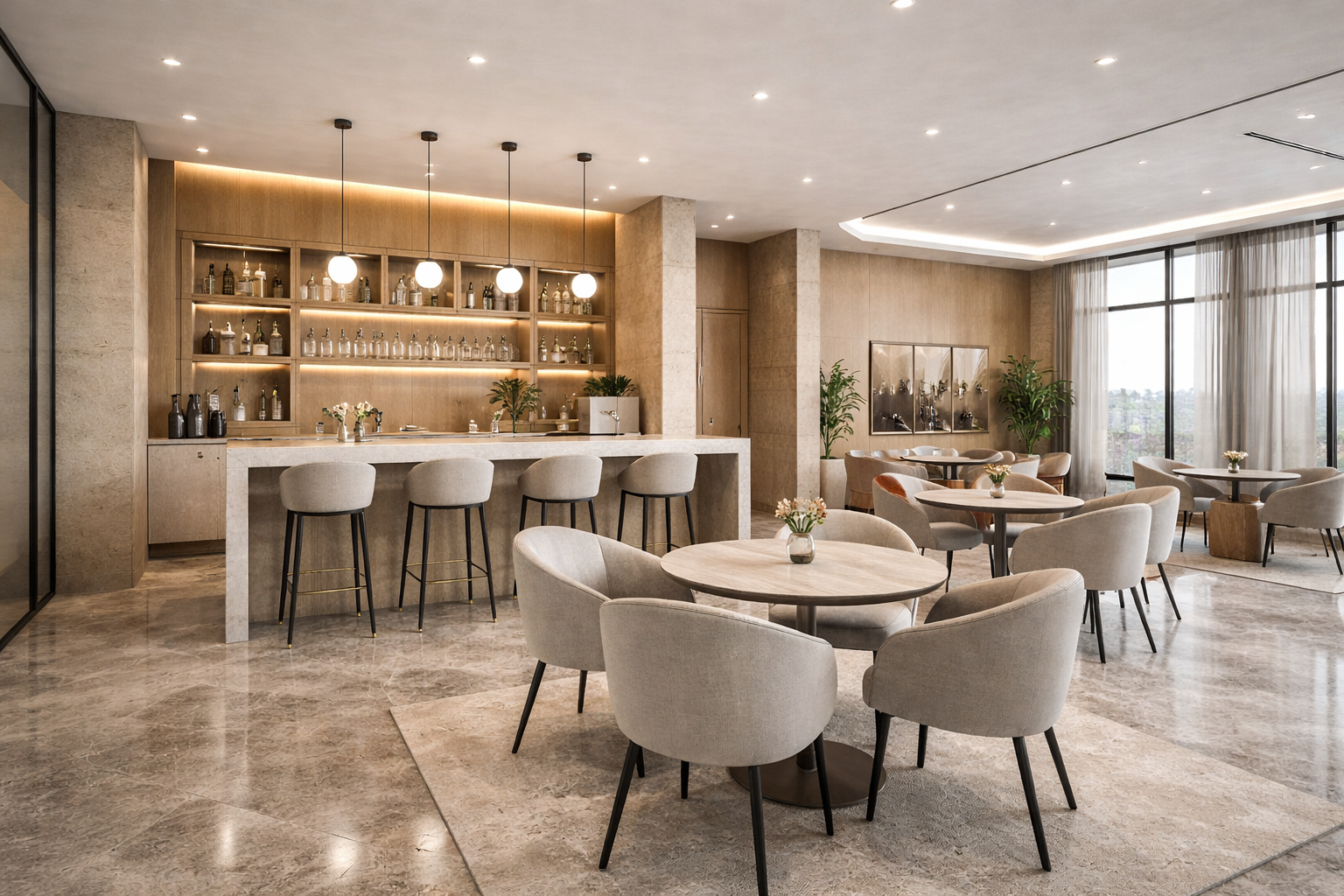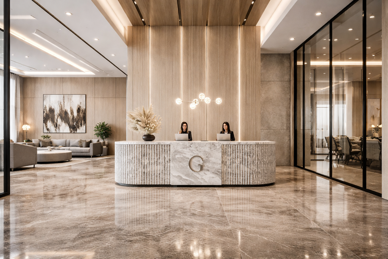 The project proposes a contemporary premium office environment defined by clarity, elegance, and spatial generosity. The design language is rooted in a refined palette of natural materials—warm wood veneers, large-format stone surfaces, and subtle metallic accents—composed in a balanced, timeless manner.